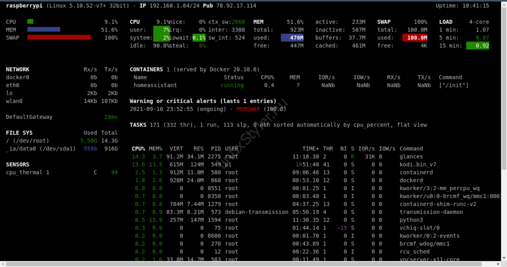 A Glances segítségével egy helyen tudod a lehető legtöbb információt kinyerni, ellenőrizni a számítógépről. És mindezt nem csak lokálisan, hanem távolról is. Rengeteg platformon telepíthető: Linux, iOS, Windows, FreeBSD. Python nyelven íródott. GitHub oldal. Számomra a legnagyobb előnye, hogy webes felülete is van így távolról is monitorozható a Raspberry Pi.